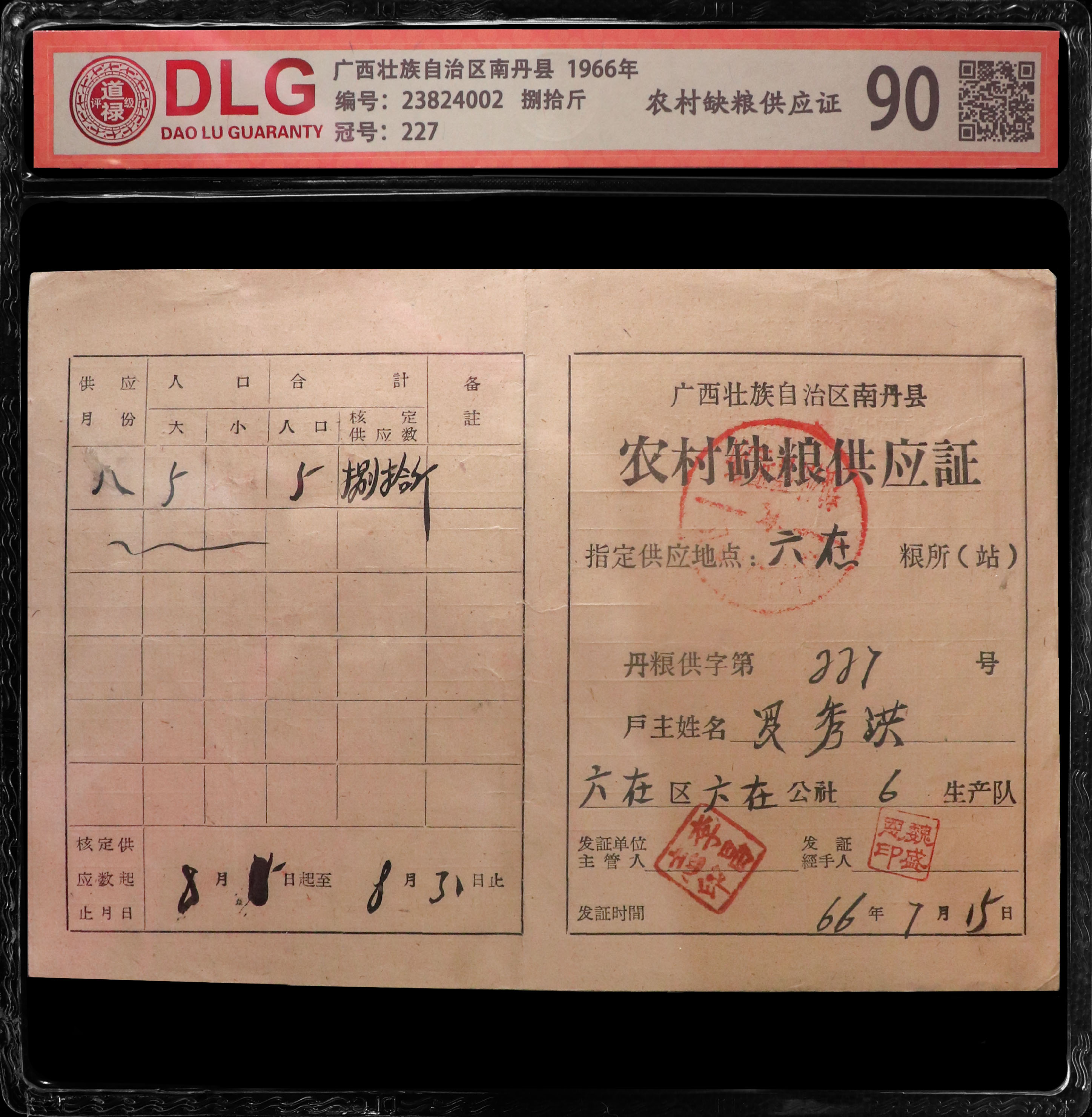 1966年农村缺粮供应证评级币/编码4002