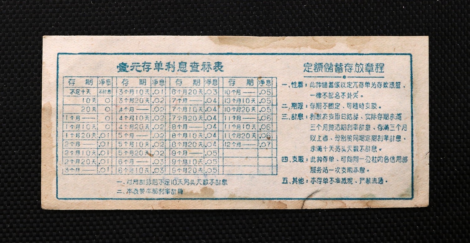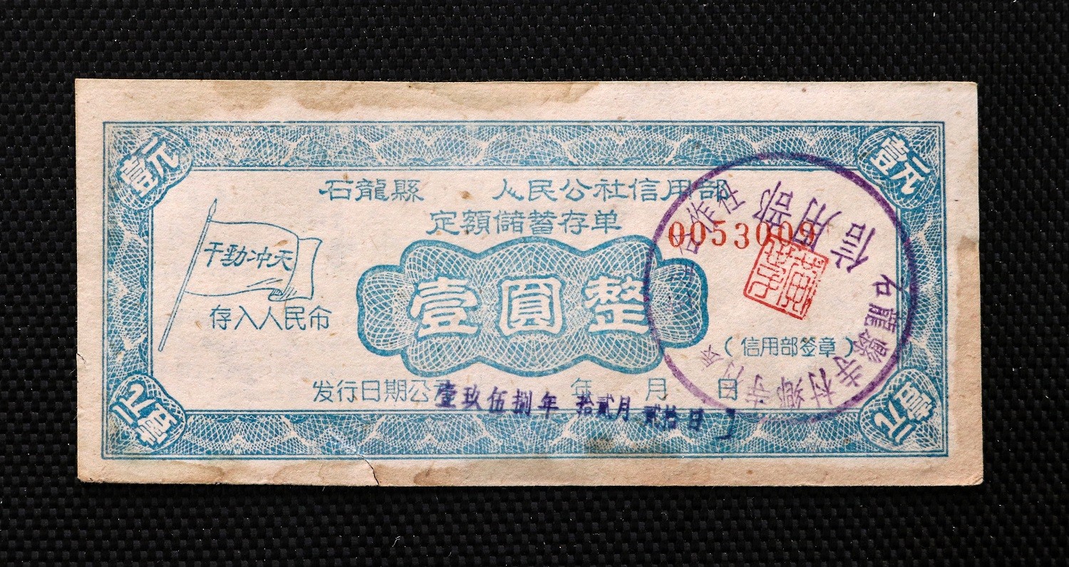 这是一枚大跃进时代的金融票证,上面有口号“干劲冲天 存入人民币”。