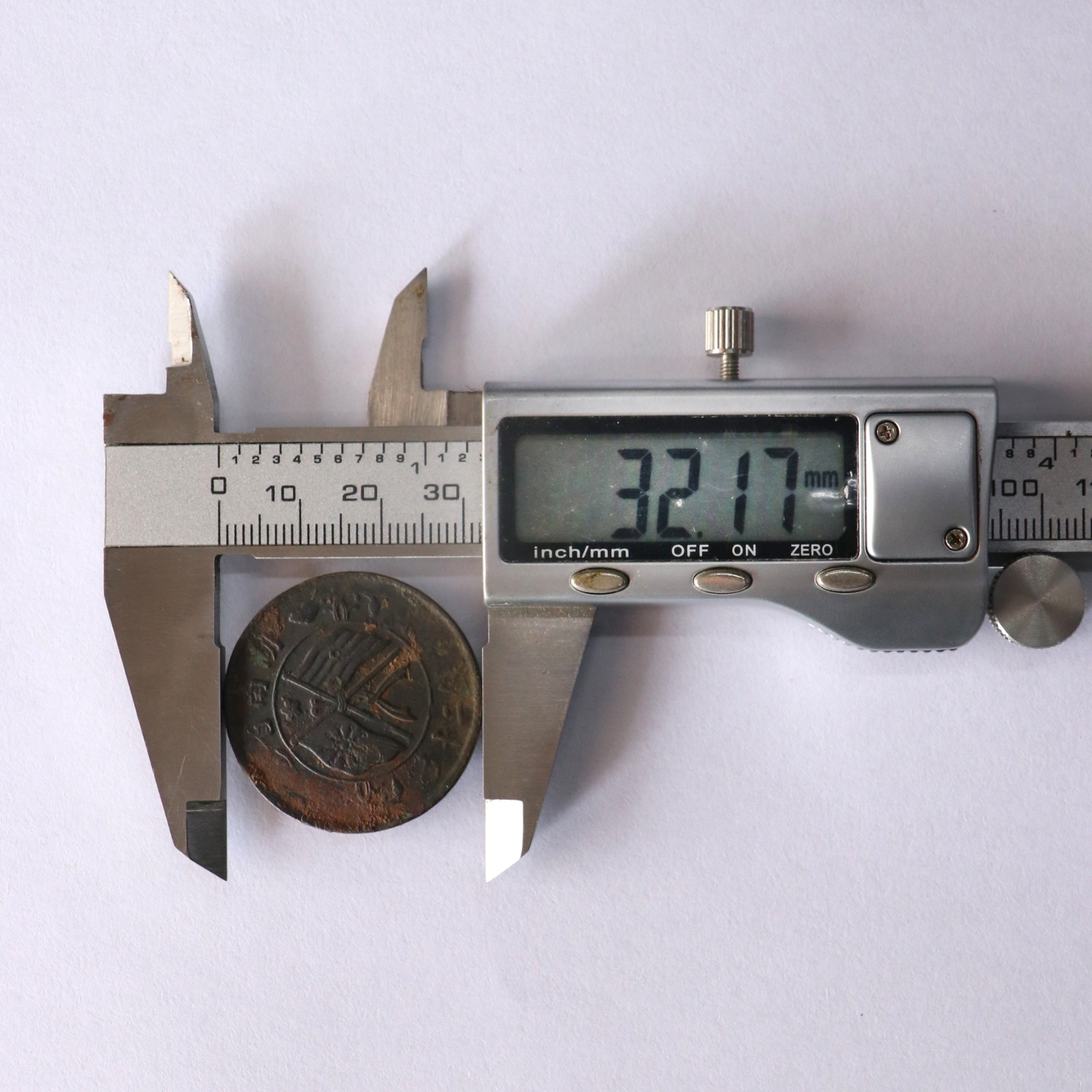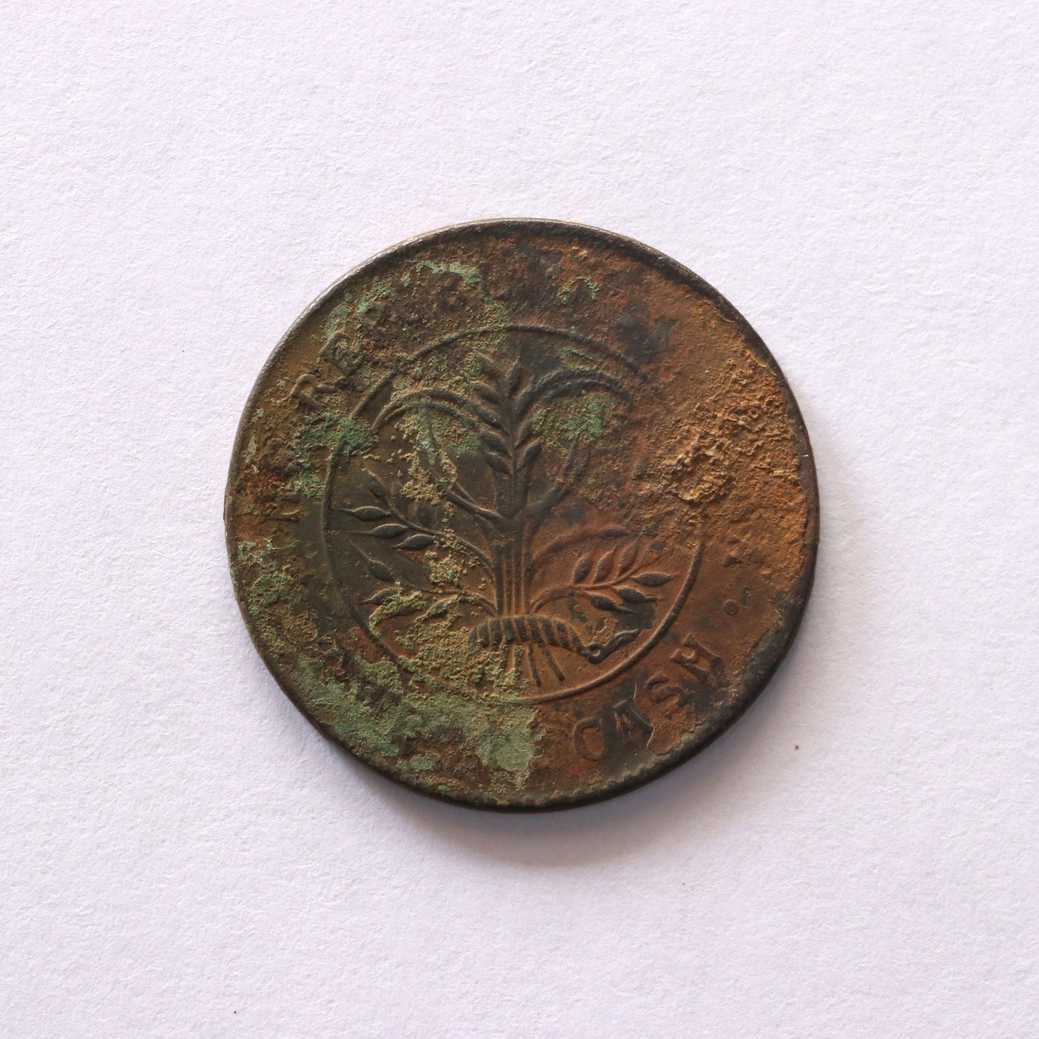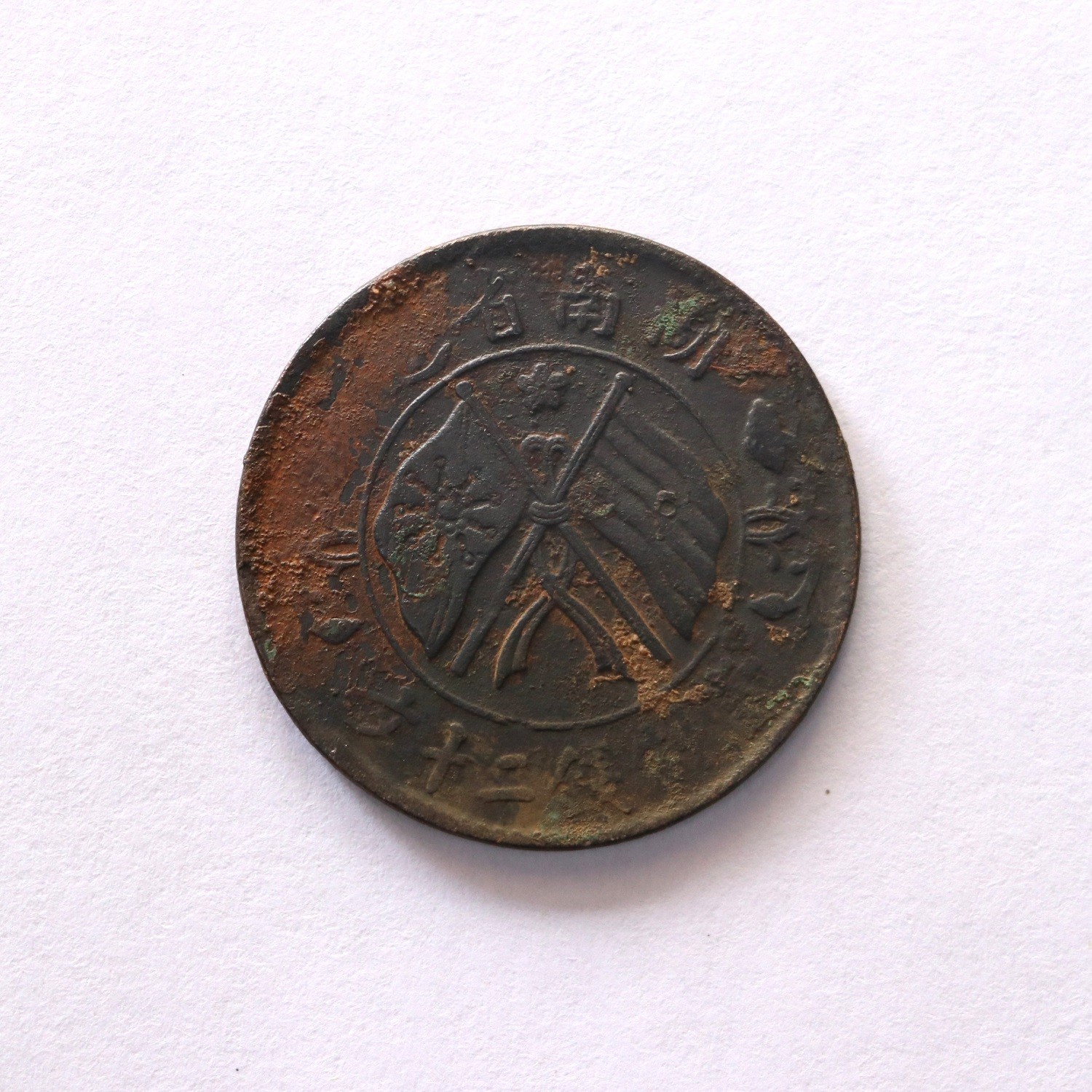 这是一枚湖南铜元当制钱二十文,正面阴五星空心兰花、双旗,背面九绕。规格:32.17*1.78