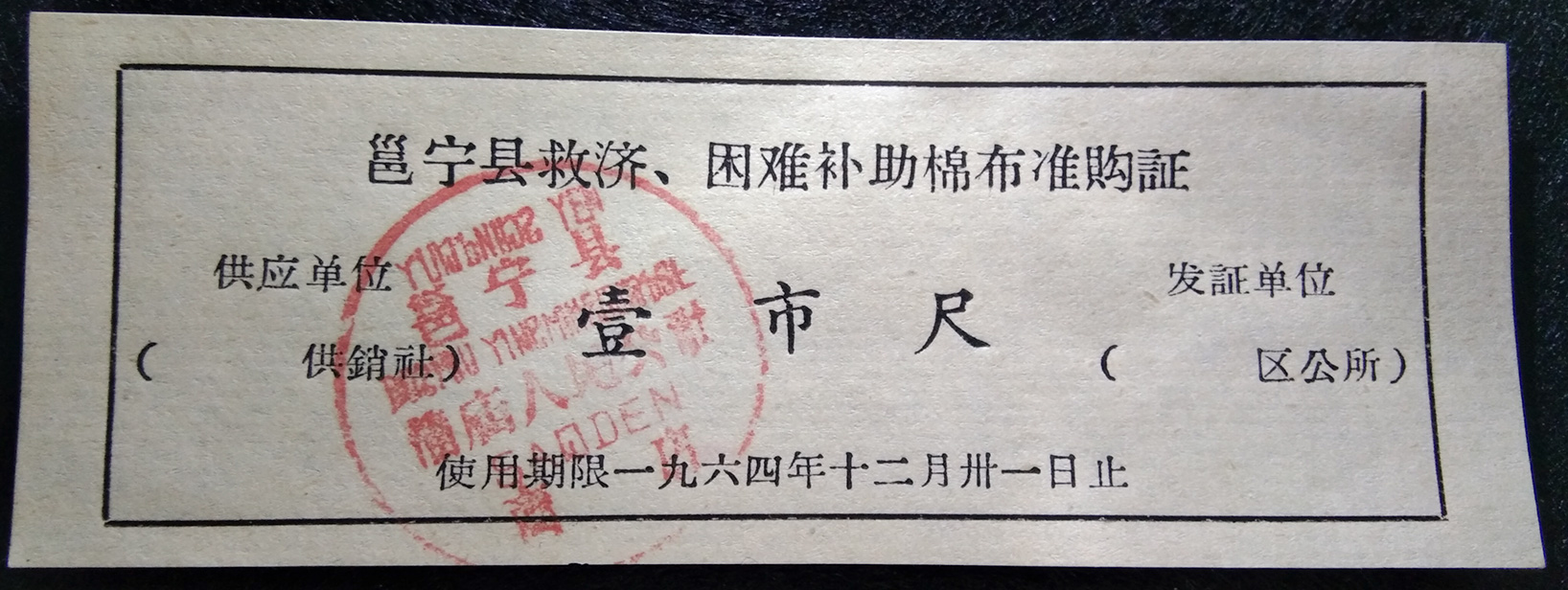 【广西1964年】广西邕宁县救灾、困难补助棉布准购证