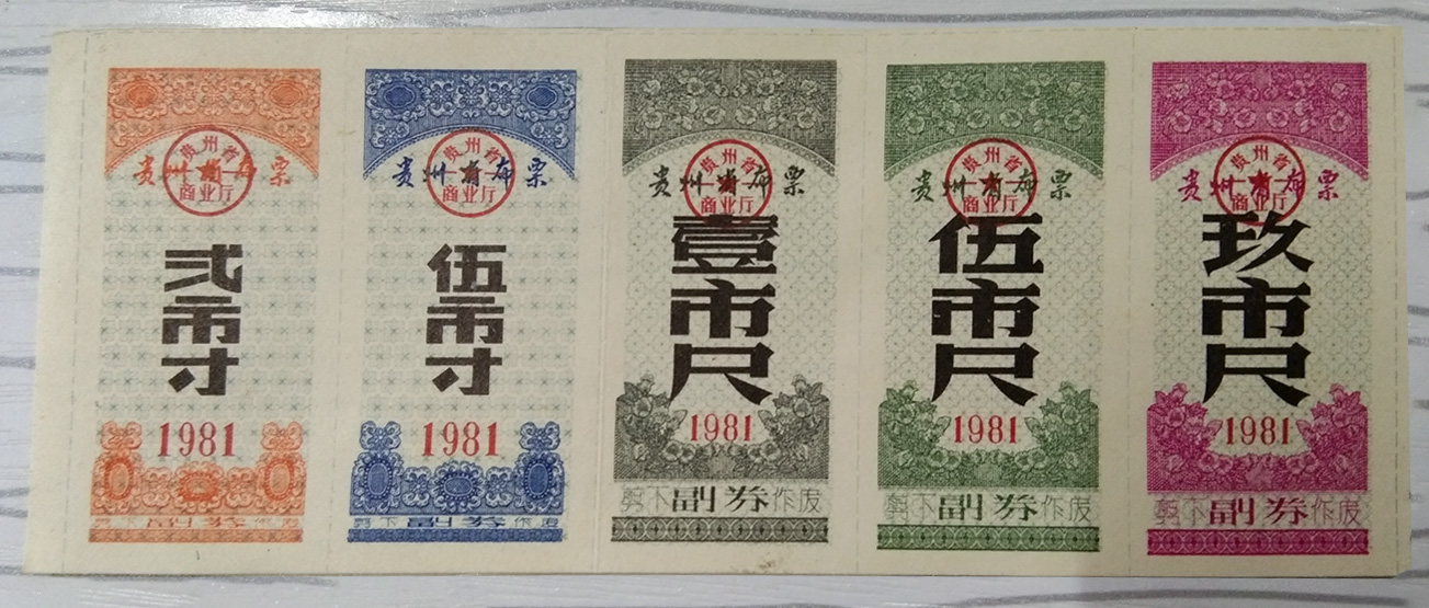 【1981年】贵州布票5全套贰寸、伍寸、壹尺、伍尺、玖尺