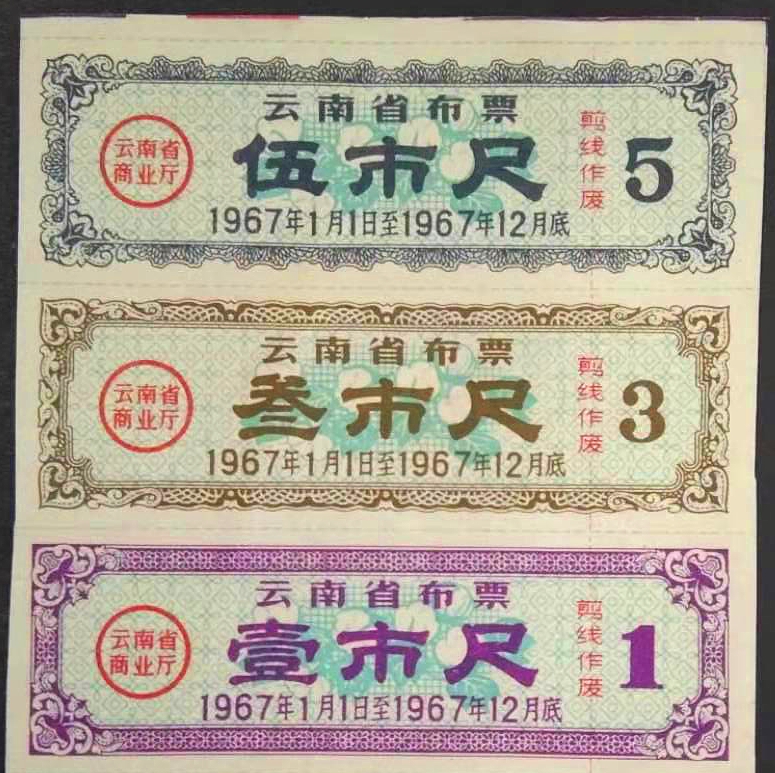 【1967年】云南布票3枚一组  壹尺、叁尺、伍尺